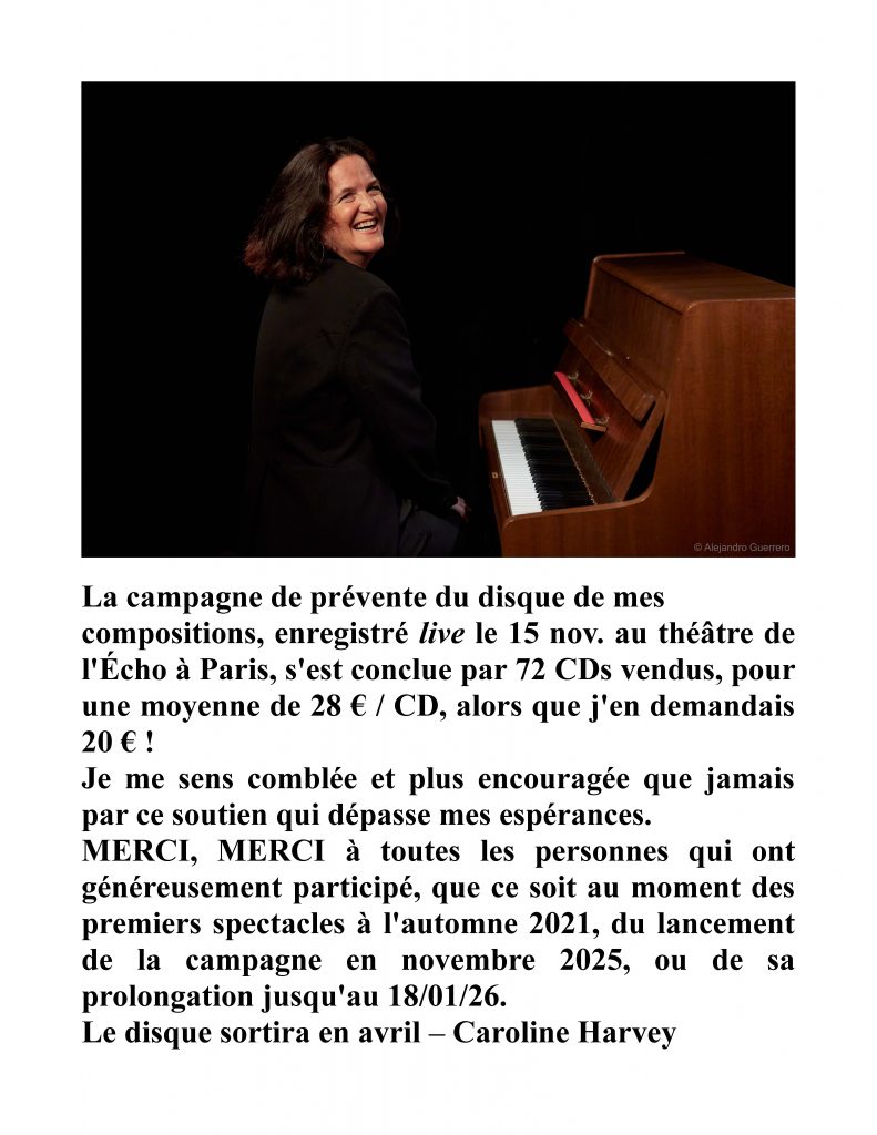 Contribuez à sa création en l’achetant à l’avance, pour 20 €. Vous pouvez donner plus si vous le souhaitez, tout geste de soutien sera le bienvenu et vivement apprécié ! Contactez-moi au contact@carolineharvey.fr pour me dire ce que vous voulez : le CD réel (que je vous enverrai par la poste ; donnez votre adresse) OU le format numérique. Donnez votre courriel pour obtenir le DVD du spectacle (format numérique seulement) que je vous offre en prime, pour vous remercier ! Le CD et le DVD seront disponibles début 2026. Vous avez jusqu’au 31/12/25 pour contribuer à cette campagne. Merci de tout coeur !